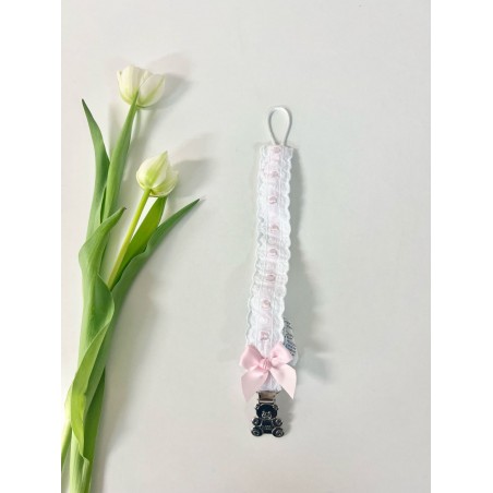 Chupetero tira bordada rosa para bebé con sujetador de osito